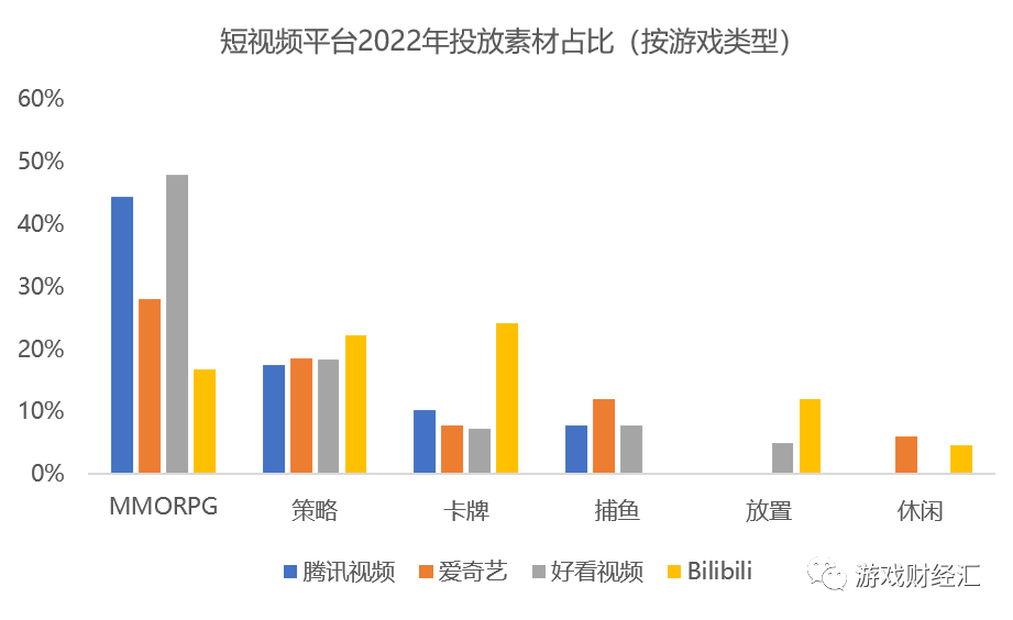 根据DataEye数据,从游戏类型来看,MMORPG、休闲、网赚、卡牌游戏是短视频平台“买量大户”,上述四大品类占据半数以上的投放素材量。(策略游戏虽投放量居前,但未成年用户占比较低)