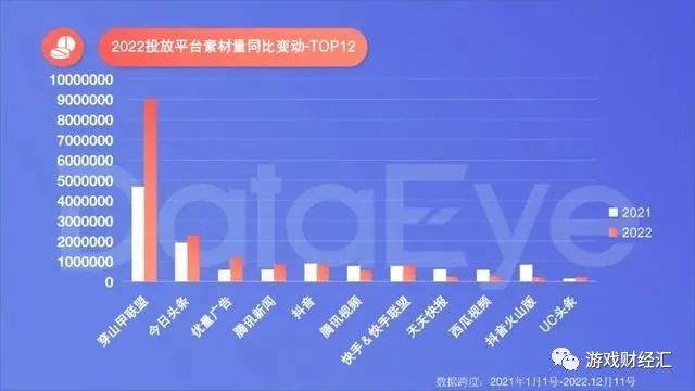 根据DataEye数据,2022年游戏买量投放渠道TOP10,视频平台占据半数席位,抖音和快手分别位列第5和第7名。