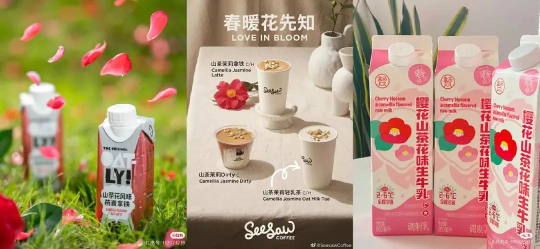 有些品牌则打出“花香Double”新招式,「SeeSaw」推出「山茶茉莉系列」,「盒马」推出了春季限定「樱花山茶味生牛乳」。