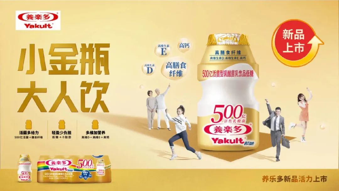 「养乐多」延续其独特风味与产品品质,推出500亿活菌型乳酸菌乳饮品低糖「小金瓶」。每瓶小金瓶富含500亿个养乐多集团独有的活性乳酸菌——干酪乳杆菌代田株,一定程度能耐受胃液、胆汁,活着到达肠道,帮助人体补充活性乳酸菌。此外,产品还主打多维加营养和低糖零脂肪的特性。每瓶产品含有3g膳食纤维、60mg钙含量、1.1μg维生素D。