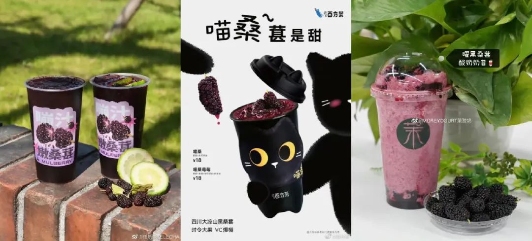 「乐乐茶」推出「大果桑」和「桑桑柠」,「茉酸奶」推出「曜黑桑葚酸奶奶昔」,保留桑葚大颗果粒,口感更丰富;「百分茶」推出了「喵桑」系列新品,精选大凉山黑桑葚,饮品周边升级,猫耳杯型搭配黑猫杯套,更有限量公仔搭配套餐出售,用全新ip“喵桑”在社媒平台掀起“黑猫浪潮”。