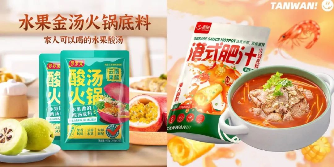 「罗罗果」发掘云南特色酸汤火锅,活用当地酸味水果,推出「酸汤火锅底料」,共有百香果、木姜子两种风味,酸辣开胃,风味层次更丰富,配料天然更健康。「贪碗」在火锅底料系列产品的基础上,推出更有地域特色的新品「港式肥汁火锅底料」,锅底以猪骨浓汤风味为基调,加上优选辣椒、白米醋,酸辣爽口,香而不腻。每份100g,轻松hold住一人食火锅、菜品烹饪等多种场景。
