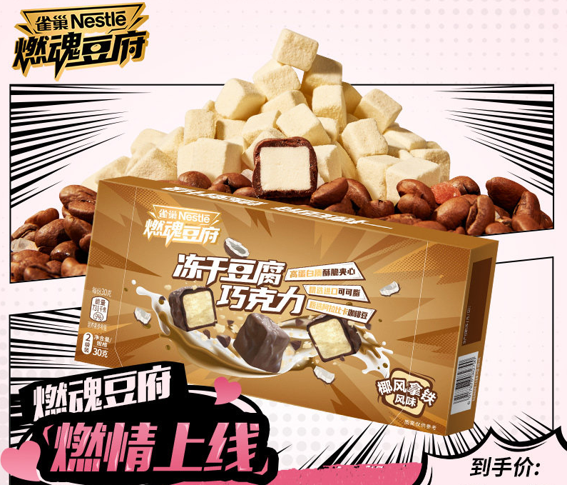 「雀巢」全新上市「燃魂豆府冻干豆腐巧克力」,带来蛋白零食新形态。产品最外层是定制麦芽糖醇黑巧克力外壳,带有岩盐脆咸颗粒及焙炒咖啡碎,包裹北大荒非转基因大豆制成的冻干豆腐芯。每盒产品(30g)含有4.3g蛋白质,0添加蔗糖和香兰素。