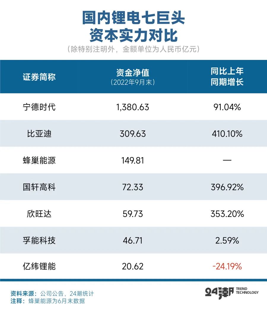 此外,24潮对比发现,相比国内锂电其他主要竞争对手,亿纬锂能资金实力是最低的,截止2022年9月末,亿纬锂能资金净值仅为20.62亿元,位居最末位,仅为宁德时代的1.49%。