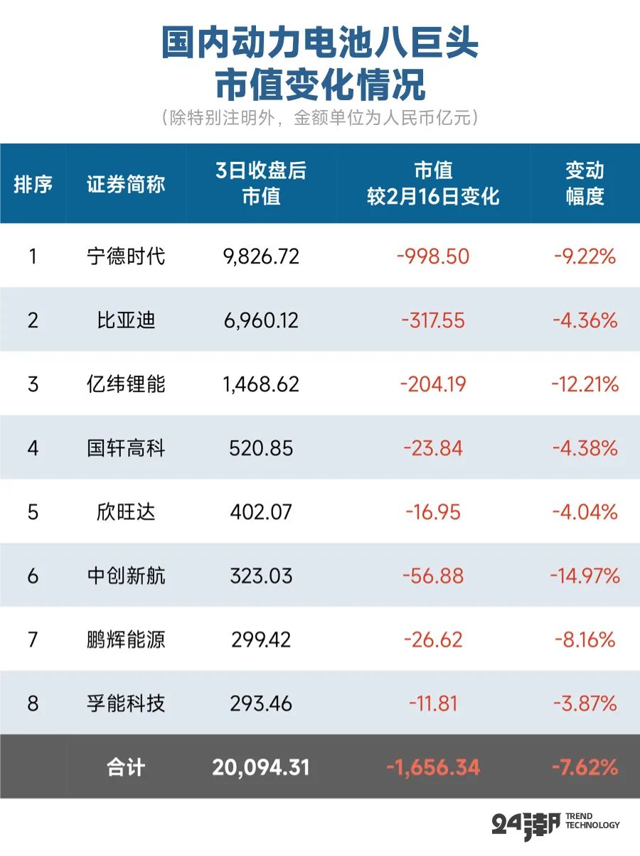 据24潮团队统计,在2月17日-3月3日这短短11个交易日中, 宁德时代、比亚迪、亿纬锂能、国轩高科、欣旺达、中创新航、孚能科技、鹏辉能源等8家企业市值全线下跌,市值合计蒸发1656亿元,降幅达7.62%,而同期上证指数上涨2.44%。