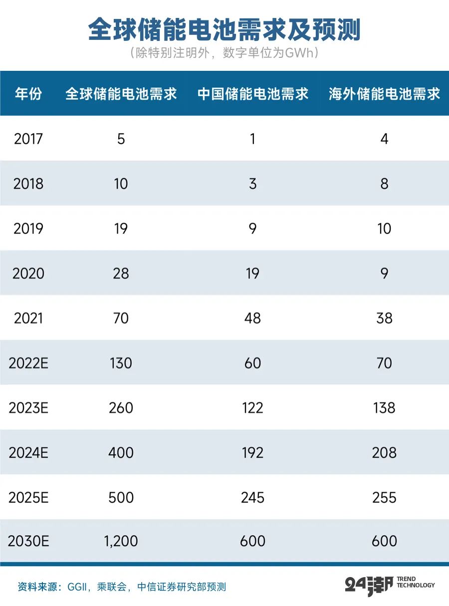 据国泰君安争取统计,23年锂电池企业预计建成约200GWh的(储能)产线,未来三年预计实现约1800GWh的产能。这显然高于中信证券预测的“到2025年全球储能电池需求量可能超500GWh,2030年可能超1200GWh”。
