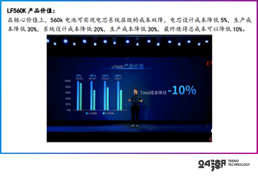 而亿纬锂能2018年就已具备280Ah电芯生产能力。2022年10月,亿纬锂能举行 “创‘芯’驱动发展引领储能T时代” 储能电池战略发布会。会上发布了亿纬锂能全新一代储能电池LF560K。该产品拥有560Ah超大容量,能量可达1.792KWh,降低总成本10%,循环寿命达1.2万次+,大铁锂电池(560K)总成本可降低10%,在TWh时代,将为全社会节省数万亿成本。