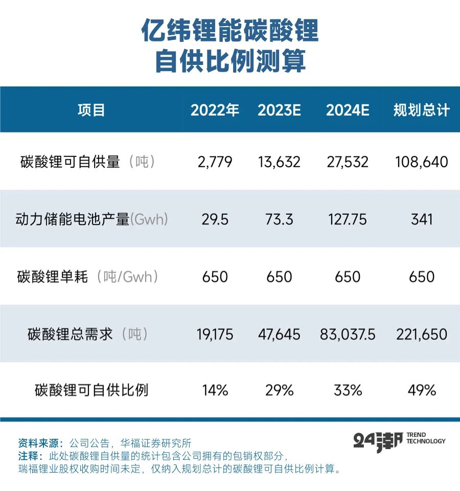 据华福证券预测,2022年亿纬锂能碳酸锂可自供量约为2779吨,自供比列约为14%,未来还将逐年快速提升,至2024年其碳酸锂自供比例将升至33%,根据其长远产能规划,未来很可能达到49%。