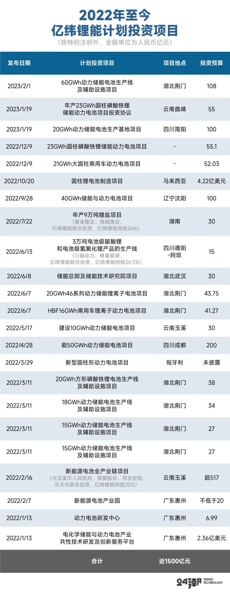 据24潮统计,2022年至今,亿纬锂能对外公布了23个重大投资项目公告,总投资预算近1600亿元,剔除与其他企业联合投资份额,其自身需投入资金也在1100亿元左右。