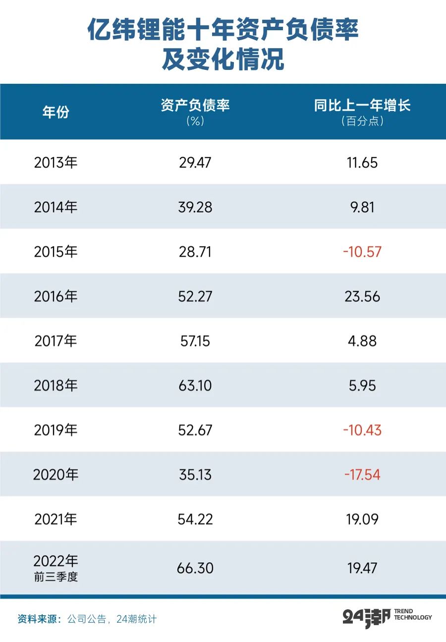 24潮统计发现,亿纬锂能在持续扩张的同时,资产负债率已飙升至历史最高水平,如下表所示,短短不到三年时间,亿纬锂能资产负债率飙升了31个百分点,截止2022年9月末,亿纬锂能资产负债率升至66.30%,同比上一年增长了19.47个百分点。