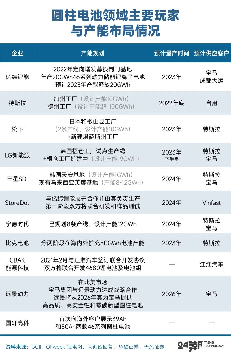 除特斯拉和宝马作为圆柱电池的积极推进者,国内车企方面包括保时捷、江淮、东风岚图、蔚来等多家主流车企也在跟进大圆柱电池。近年已经有宁德时代、亿纬锂能、 LG新能源、松下电池、三星SDI、远景动力、比克电池、国轩高科、蜂巢能源等多家头部电池企业宣布重金布局圆柱电池,且均取得了阶段性进展,另外,根据比亚迪此前公布的专利信息,电池中国推测其貌似也已经在研发 “大圆柱” 电池。