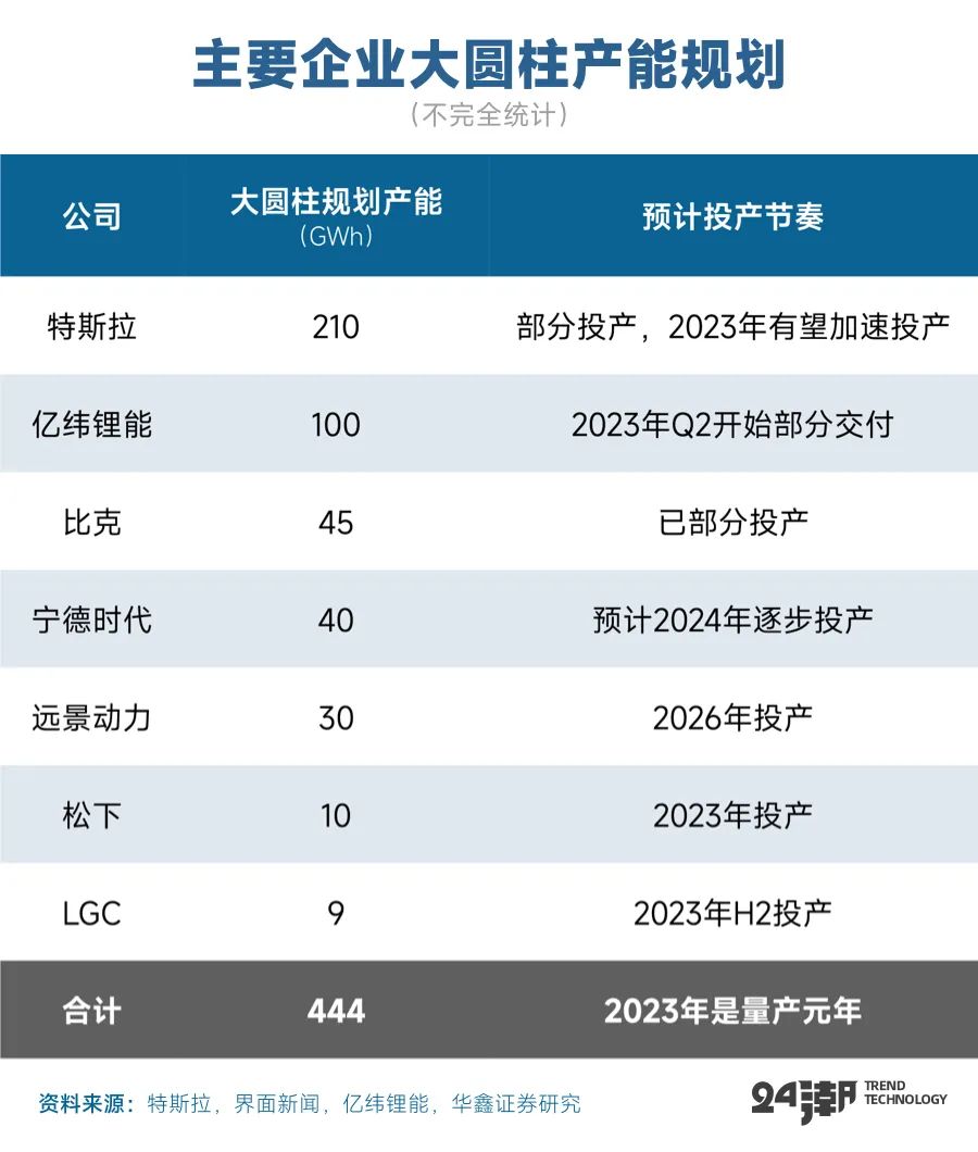 据华鑫证券统计,亿纬锂能在圆柱电池领域产能规划已达100GWh,仅次于特斯拉的210GWh的产能规划。市场预计2023年亿纬锂能大圆柱其有效产能可达5-10GWh,24年其荆门20GWh项目将全部达产。