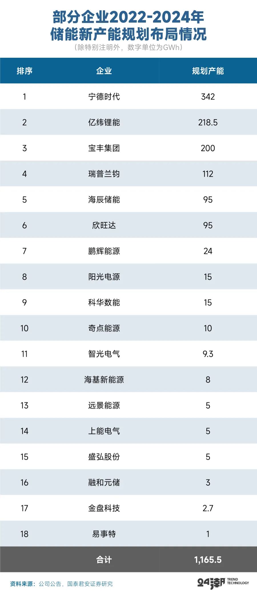 根据亿纬锂能战略规划,到2025年其将实现电力储能100GWh产能规模。而据国泰君安统计,目前亿纬锂能储能产能规划约为218.5GWh,仅次于宁德时代的342GWh。