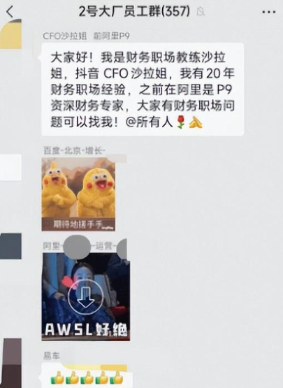 根据一位与“沙拉姐”同群的群友爆料,“沙拉姐”自称是阿里资深总监P9,抖音CFO,拥有20年的职场财务经验。而群主则介绍她是真正的大佬,在阿里直接向俞永福(阿里本地生活CEO)汇报。而“沙拉姐”则称也和昆阳(饿了么执行总裁)搭档过。