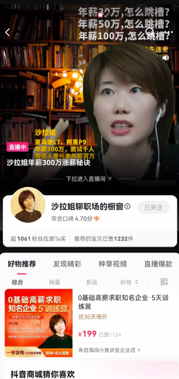 从抖音橱窗的销售量看,沙拉姐售价为199元的求职名企课,销量为1124份,计算可知抖音单渠道的卖课收入为22.3万元。相比抖音上那些粉丝千万的网红,已经卖出几千万、上亿元的私董课,大厂高P卖课战绩还不算突出。