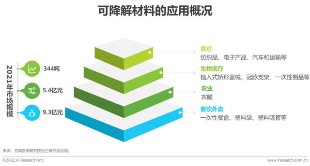在行业应用上,可降解材料已被广泛应用在农业、餐饮、生物医疗上。艾媒咨询数据显示,2021 年可降解材料的市场规模已超 14 亿元。