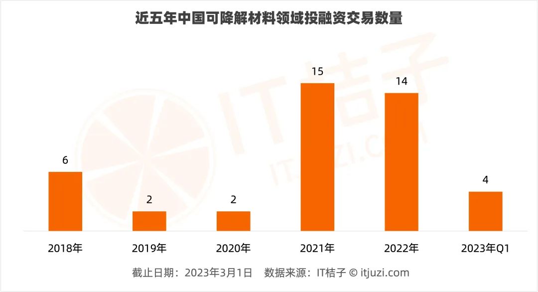 IT 桔子数据显示,2018 年至今,中国可降解材料领域投融资事件超 40 起,投资交易集中在 2021 年、2022 年,事件数量由之前的零星几起上升至十几起。此外在投资金额上,超亿元的巨额融资事件近年来频现。