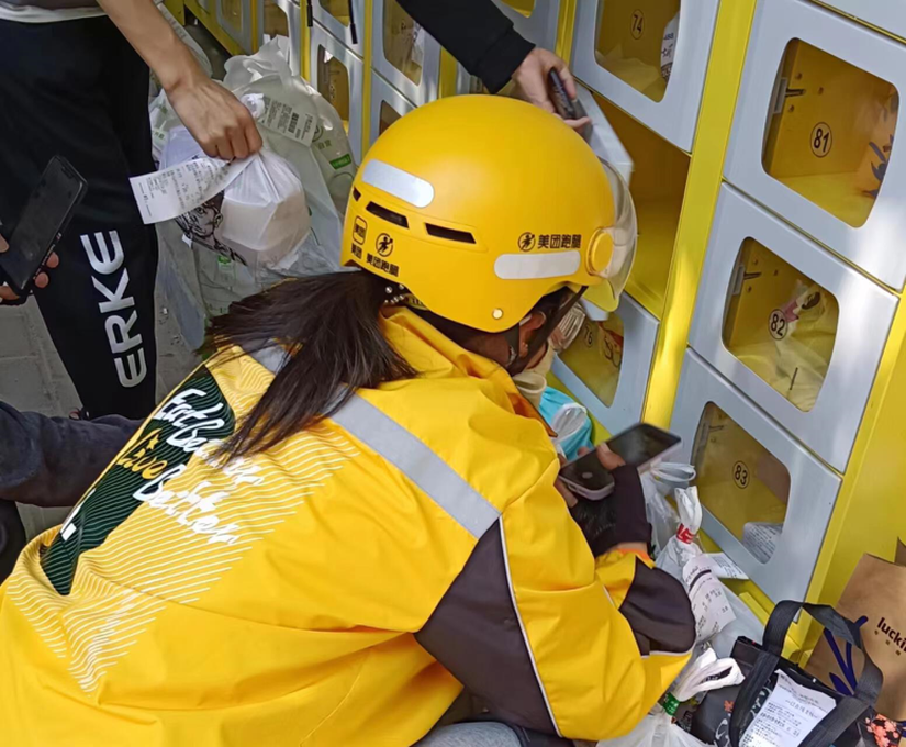 午餐高峰期,骑手们都聚集在外卖柜的另一侧
