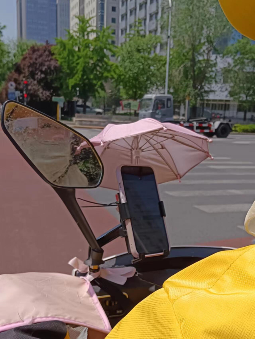 跑单时,王然也会给收集撑起粉色遮阳伞