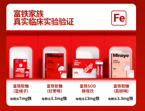 目前,除富铁软糖外,美那有富铁家族拥有蓝帽子铁凝胶糖果、荔枝口味0糖富铁软糖以及单只含铁量高达13mg的富铁饮。