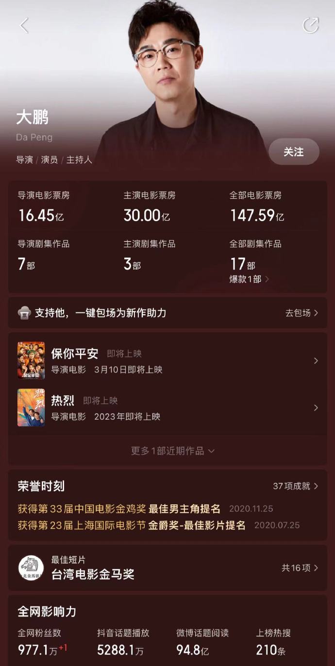 据@猫眼专业版 微博消息,3月8日14时,大鹏主演电影《保你平安》预售票房破1400万,大鹏主演票房破30亿。