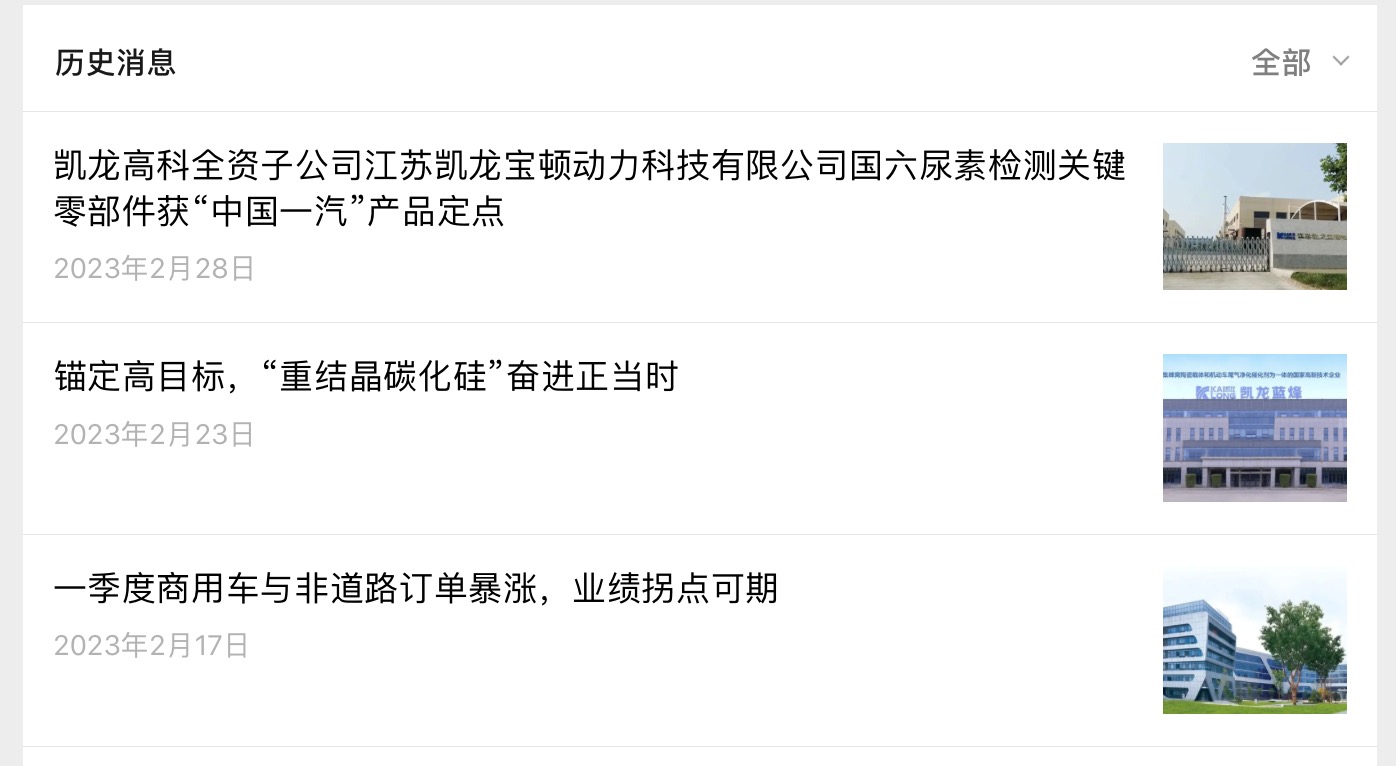 比如2月17日《一季度商用车与非道路订单暴涨,业绩拐点可期》,2月13日的《锚定高目标,“重结晶碳化硅”奋进正当时》,以及2月28日的《凯龙高科全资子公司江苏凯龙宝顿动力科技有限公司国六尿素监测关键零部件获“中国一汽”产品定点》。公司2月17日、2月23日发布的文章显示,“随着非道路国四的实施,近期迎来雪花般的订单”“公司后处理产品供不应求”“前期由于排放升级换代导致毛利率下降较快的诸多问题预计也会逐步得到解决”。这与预告中的消极描述不一致。