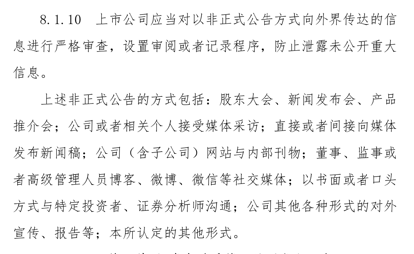 另第8.1.10条显示,上市公司应当对以非正式公告方式向外界传达的信息进行严格审查,设置审阅或者记录程序,防止泄露未公开重大信息。