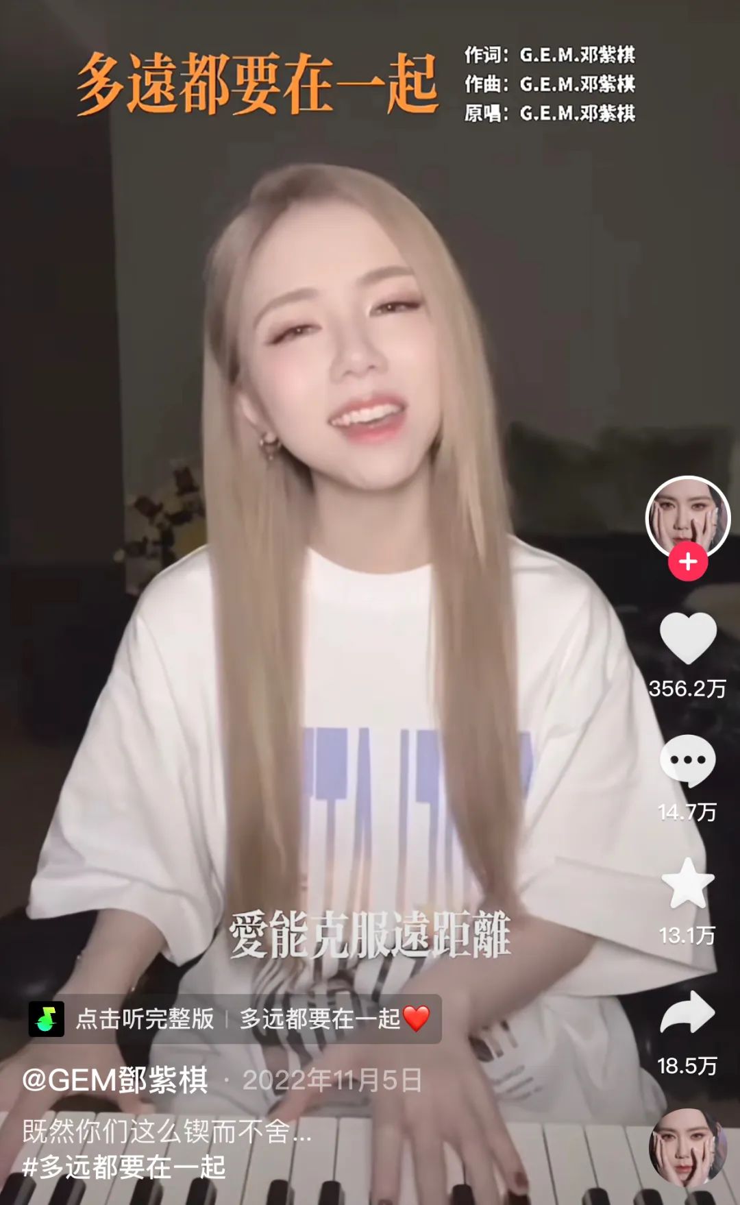 对于成名歌手,突然有一首歌成为神曲,显然是攻占新媒体的重要契机。不少歌手都会在歌曲翻红时在抖音发起合唱,打造亲民形象的同时巩固大众口碑。比如邓紫棋的《多远都要在一起》,首发舞台是2015年的春晚,这首歌一直凉了7年,直到2022年才在短视频爆红。邓紫棋也在网友的强烈要求下,重新弹唱这首歌,收获356.2万赞。