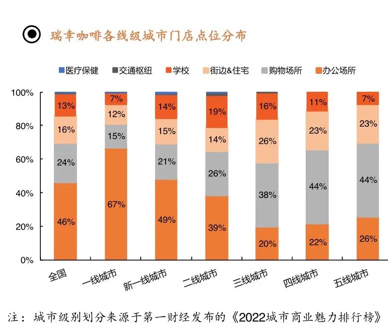 更细致些,一线城市中,办公场所门店占比最高,达67%。随着门店布局的不断下沉,商场店及社区店的特征愈发明显,四五线城市购物场所+街边&住宅店占达67%。