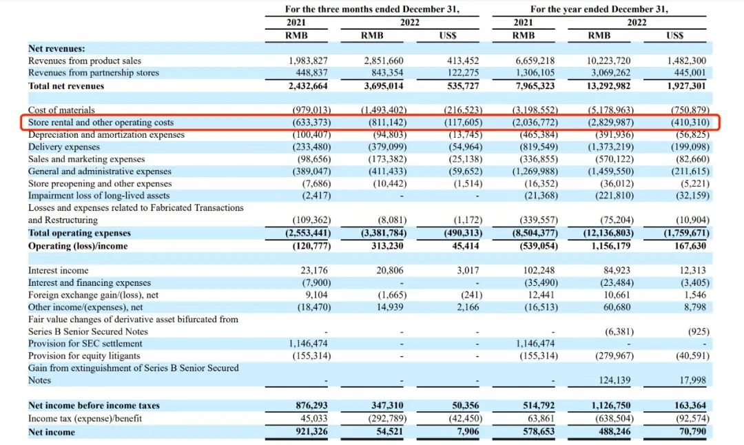对于2022年第四季度不佳表现,郭谨一在财报后的电话会上解释称利润回落与疫情影响有关。“剔除北京、上海等城市数据后,同店增长仍保持双位数增长。”财报中提及,瑞幸咖啡2021年同期的净利润为9.21亿元人民币,其中包括因撤销SEC结算拨备而产生的一次性非现金收益11.47亿元人民币。