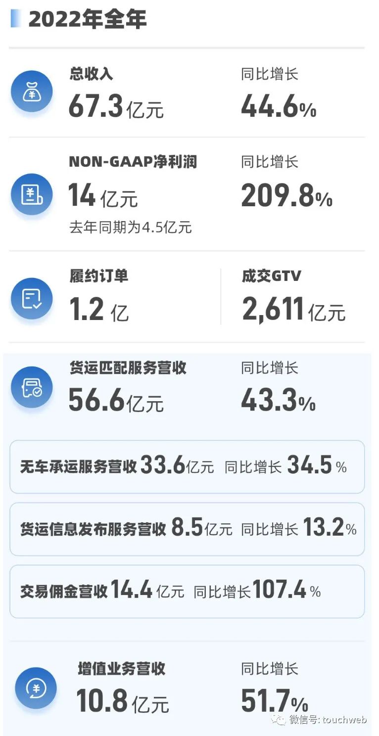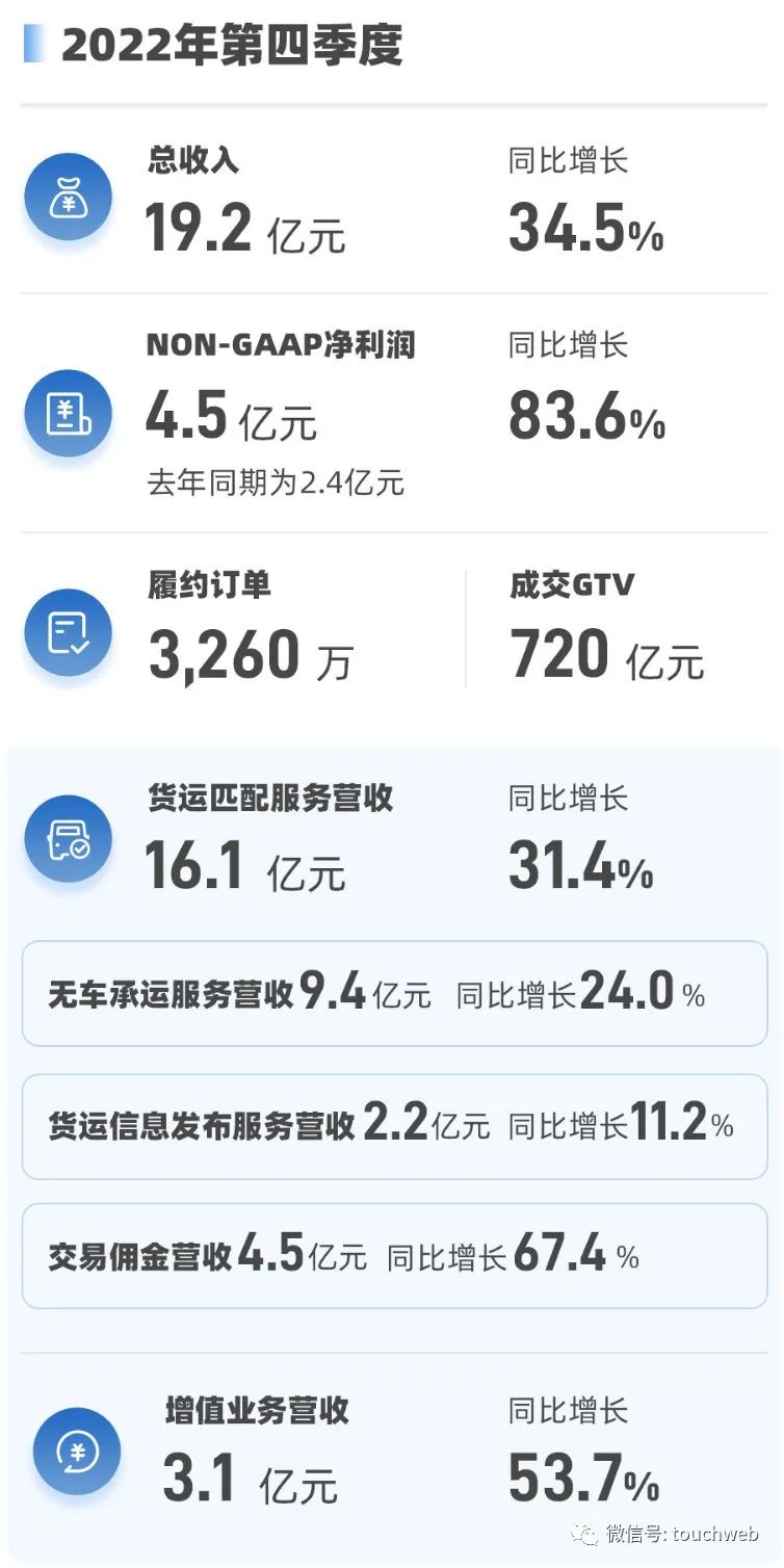 满帮集团2022年第四季度来自货运匹配服务营收16.14亿,较上年同期的12.29亿增长31.4%;增值服务营收3.08亿,较上年同期的2亿元增长53.7%。