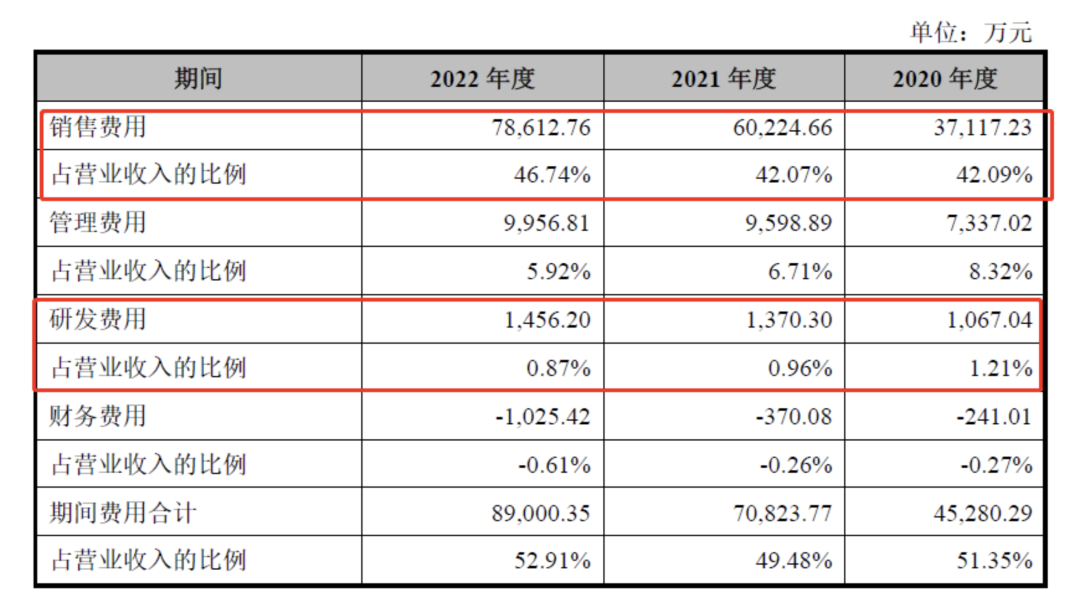 招股书显示,2020年-2022年,毛戈平的销售费用分别为3.71亿元、6.02亿元和7.86亿元,分别占营收的42.09%、42.07%和46.74%。