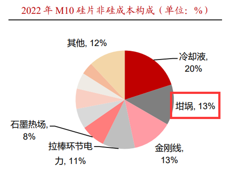 在拉晶过程中,光伏石英坩埚用于盛放熔融的多晶硅料,使用350小时左右便需要更换,属于高频易耗品。以M10硅片为例,光伏高纯石英坩埚在非硅成本中占比约13%,是硅片主要非硅成本之一。