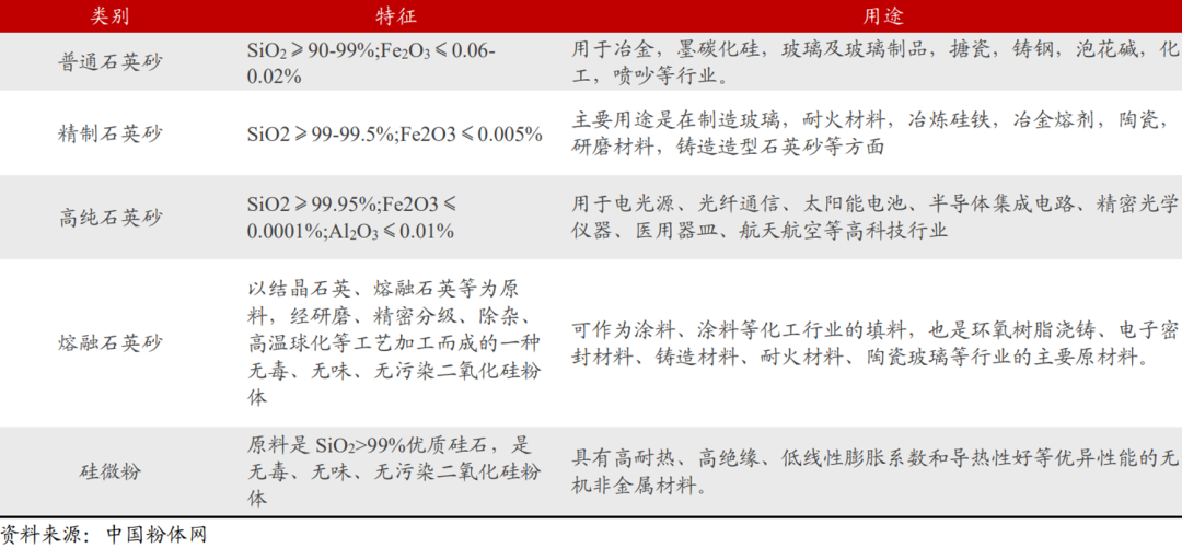 一般把 SiO2 纯度含量高于 99.95%的石英砂定义为高纯石英砂,广泛应用于电光源、光纤通信、太阳能电池等领域。具体的可以将高纯石英砂分为低端(3N)、中端(4N)、高端(4N8)的产品。光伏级高纯石英砂通常指 SiO2纯度含量达到 4N8 级别的高端石英砂。