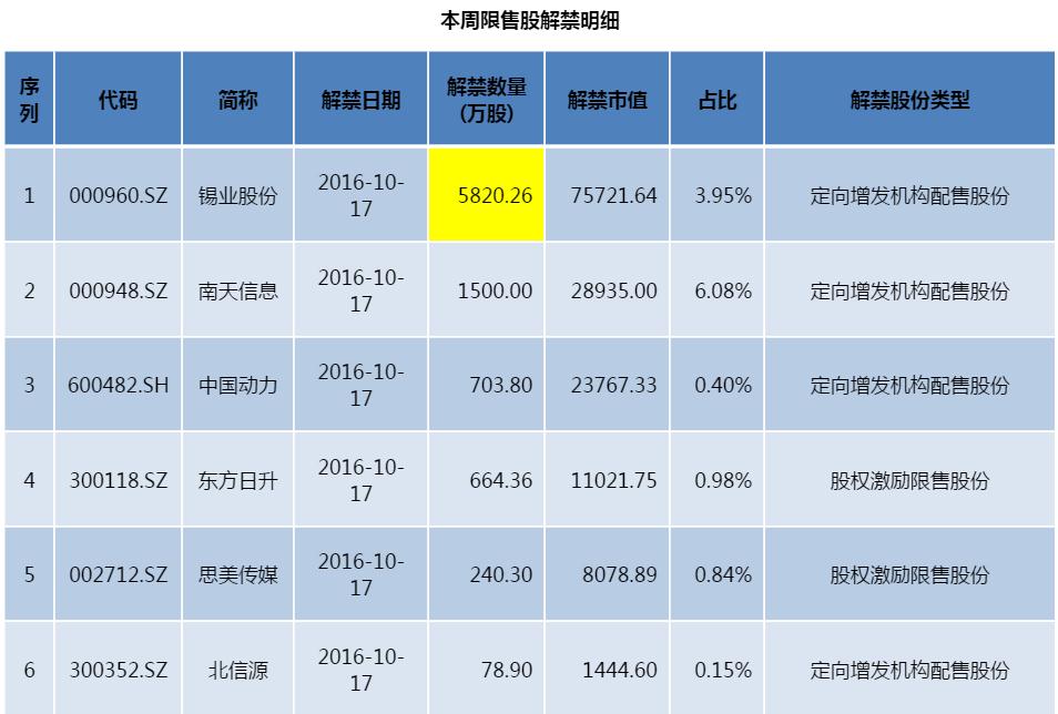 以10月15日收盘价计算,本周解禁市值超过10亿元的公司也只有1家,是上海新阳(300236.SZ),龙星化工、锡业股份紧随其后。