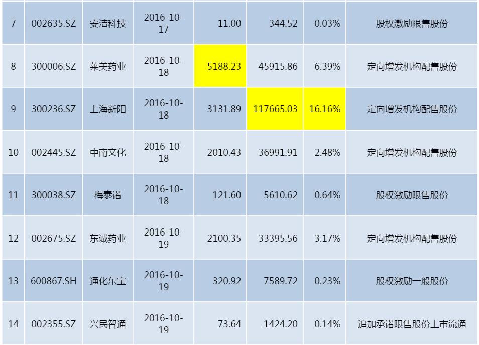 本周解禁市值最大及总股本占比最高的是上海新阳,公司日前公告,10月18日将有3131.89万股限售股上市流通,占比16.16%。不过,因2015年考核业绩未达标,部分股票不得解锁,并由公司回购注销,因此本次解除限售的股份实际可上市流通的数量为1663.82万股,占公司总股本的8.59%。