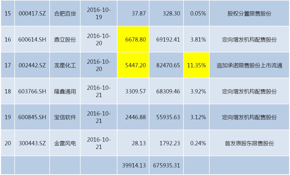 根据计划,龙星化工将在10月20日有5447.20万元限售股上市流通,解禁市值8.25亿元,占总股本比例11.35%。公司目前暂未披露限售股上市流通公告。
