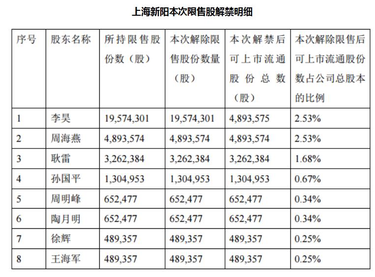 李昊同时身为上海新阳公司董事,根据规定,在其任职期间,每年通过集中竞价、大宗交易、协议转让等方式转让的股份不得超过其所持本公司股份总数的25%,离职后6个月内不减持其所持有的本公司股份。因此,上海新阳解禁压力也不算大。