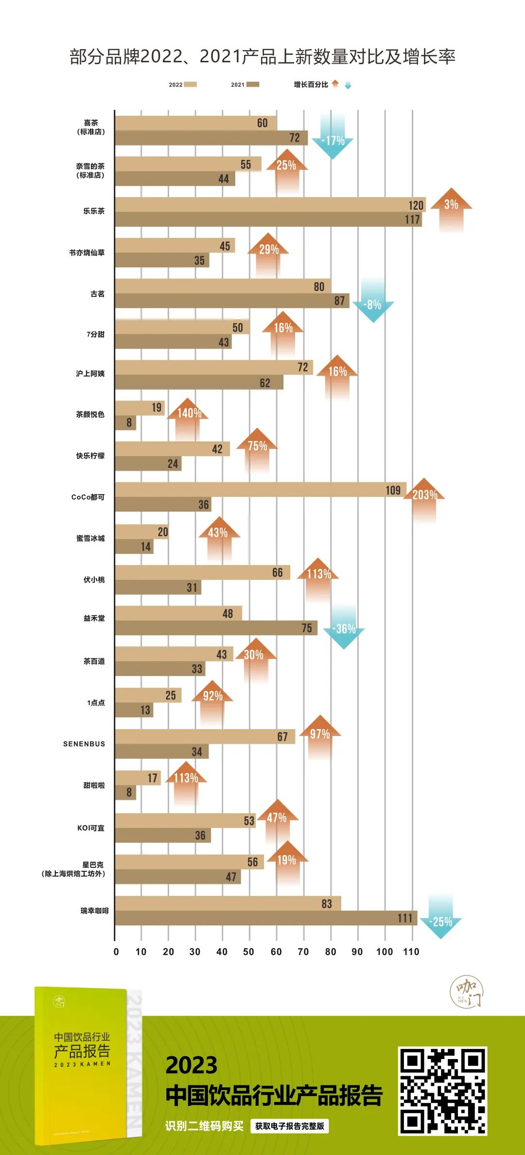 CoCo都可、茶颜悦色、伏小桃、甜啦啦是统计品牌中上新数量增长率的Top3,增长率均超过100%,CoCo都可2022年上新达到了109款,比2021年多了73款。