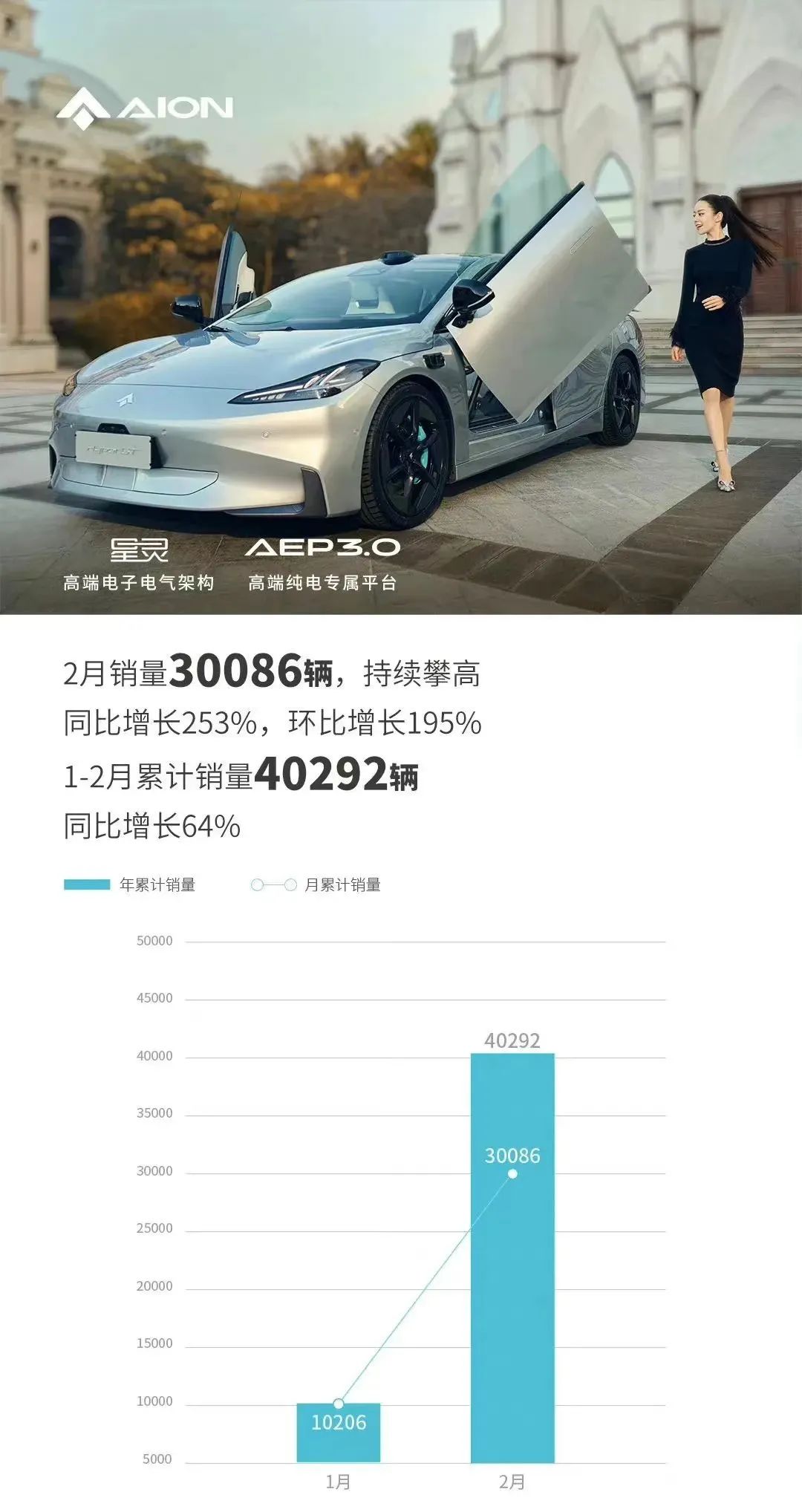 广汽埃安则在2月实现了绝地反击的“大翻盘”,以最猛的140%环比增长,重新回到月销3万区间,排行位列第二。要知道其在1月份销量曾出现巨幅下滑,从去年12月的月销三万,骨折到今年1月的1万,骤降三倍。而短短一个月的时间重新恢复昔日的活力,展现出了充分 的市场定力与韧性。
