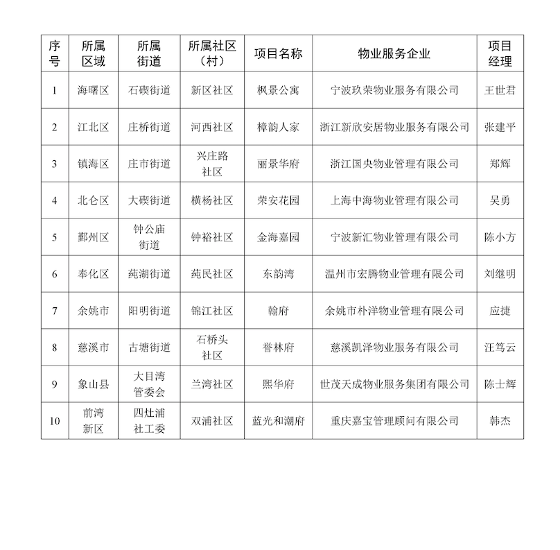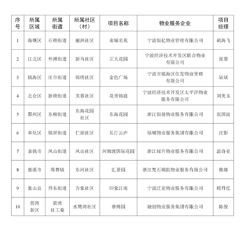 3月8日,宁波市住建局公布2022年第四季度住宅小区物业服务项目“红黑榜”,其中10个住宅小区物业服务企业列入“红榜”项目名单,10个住宅小区物业服务企业列入“黑榜”项目名单。