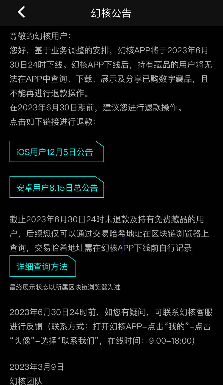 3月9日,腾讯旗下数字藏品平台幻核发布下线通告:基于业务调整的安排,幻核APP将于2023年6月30日24:00下线。幻核APP下线后,持有藏品的用户将无法在APP中查询、下载、展示及分享已购数字藏品,且不能再进行退款操作。幻核建议用户在2023年6月30日期前进行退款操作。