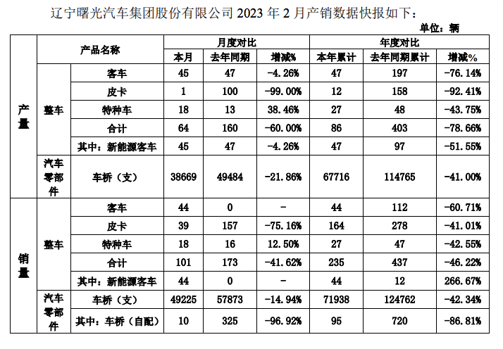 3月7日,ST曙光公告称,公司2月整车销量101辆,同比下滑41.62%;前2月整车销量235辆,同比下滑46.22%——对于一家整车车企来说,将将过百的月销量,基本等于宣告“死亡”。