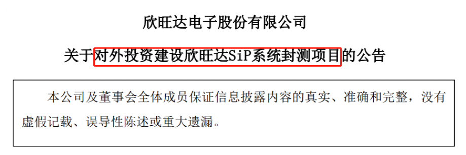 3月7日,欣旺达董事会、监事会会议审议通过了《关于对外投资建设欣旺达SiP系统封测项目的议案》,同意欣旺达全资子公司浙江欣旺达在浙江省兰溪市投资建设“欣旺达SiP系统封测项目”。