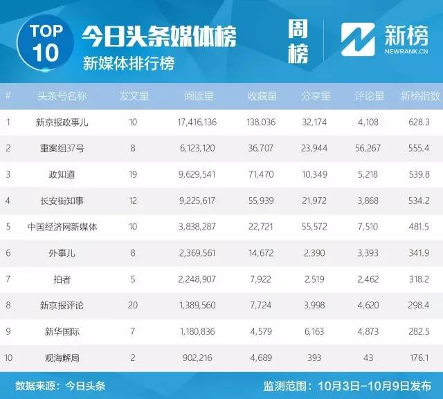 今日头条发布的报纸类头条号榜单上,新京报以超过18亿、12亿的阅读量仅次于参考消息,连续获得第2名的位次。特别显眼的是,新京报的新媒体头条号“新京报政事儿”连续两周获得新媒体榜单的第1名。