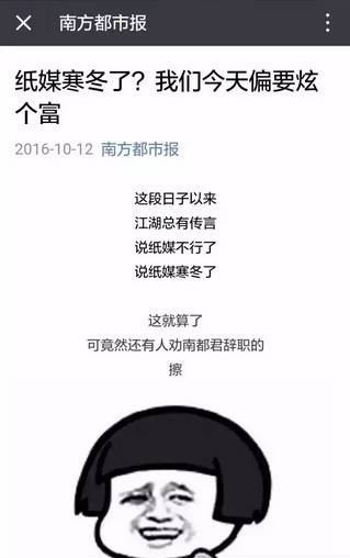 12日,《南方都市报》通过微信公众号高调发声,反驳纸媒寒冬的观点,还举证自己9月30日的广告营业额就有3000万,似乎要判定“纸媒已死”的谣言性质!