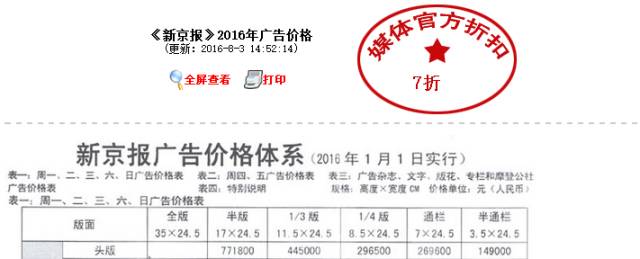在“媒体资源网”上2016年8月3日更新的新京报官方广告折扣是7折。融媒君咨询新京报广告部的工作人员,刊例价格为77.18万的半幅头版广告实际只需40万,实际折扣接近5折。而且在融媒君表示对纸媒广告效果提出担忧后,工作人员即推荐新京报新媒体的广告位,包括新京报网和新京报、政事儿等微信公号。