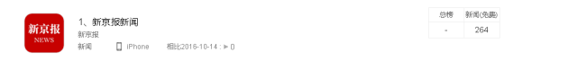 融媒君在ASO100查询新京报新闻APP的数据情况,发现iPhone平台上“新京报新闻”APP在新闻类排名264位,相比于“南方周末”70名的位次,相差很多。再查看360助手的应用市场,使用“新京报新闻”APP的用户只有9万人,Android版本的最近更新还是2014年12月4日。