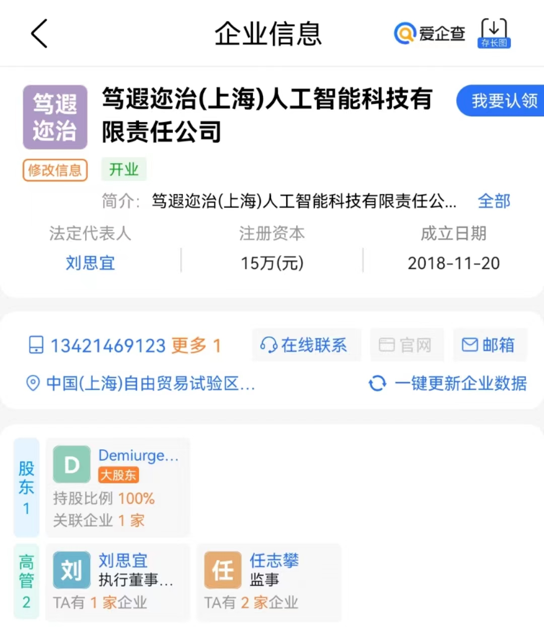 在爱企查输出“笃遐科技”,可以发现一家名为“笃遐迩治(上海)人工智能科技有限责任公司”的小微企业,成立于2018年,注册资金为15万元,法定代表人为刘思宜。