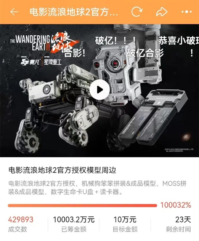 比较典型的是今年的春节档电影《流浪地球2》周边重筹。赛凡科幻仅用了9天时间,众筹金额就突破1亿元,让行业里不少声音开始探讨周边生意的成熟。